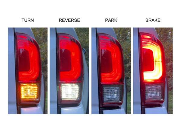 VTAILS Convert your stock 2016+ Toyota Tacoma tail lights to dual red park/brake lights and amber turn signals while maintaining a white reverse light.
