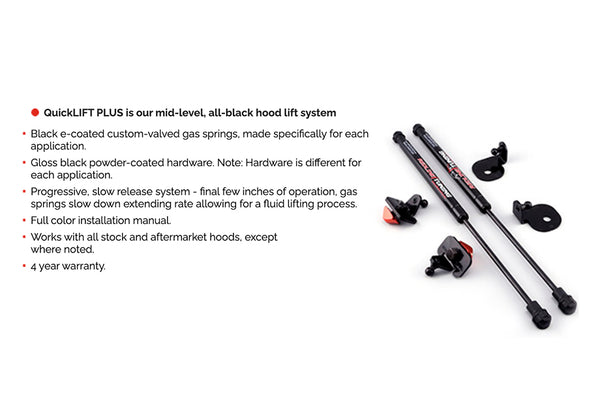 Quick and simple installation – We design every QuickLIFT system and we write all of our own documentation. FULL-COLOR installation manuals will arrive that will walk anyone through this simple installation - our customer comes first. You do NOT need to be a mechanic or car nut like us - we are so confident in our products that we post every installation manual on our website for you to review prior to ordering.
