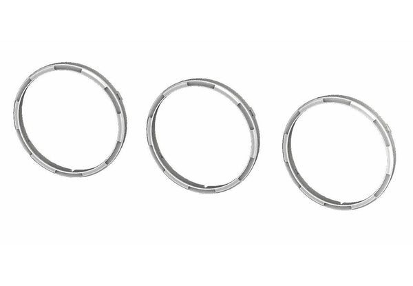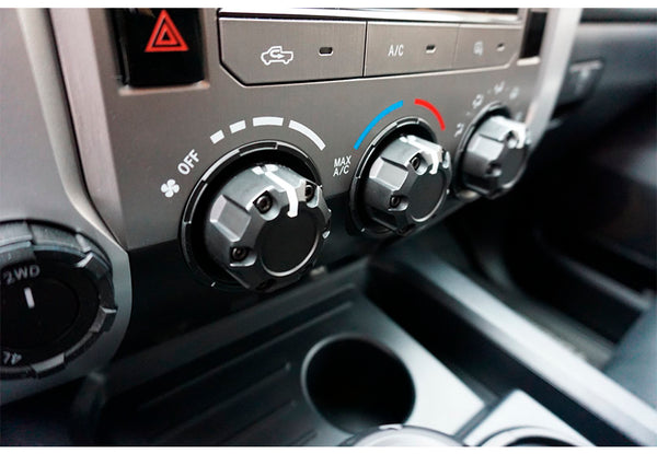 Climate knob trim rings for the 2014+ Tundra, all trim levels. Includes 3 rings and one flat piece. 3 knob applications will discard the flat piece, and 2 knob applications will discard the center ring. Injection molded of high strength and impact-resistant ABS plastic. Easy install, though some dash disassembly is required. These snap in like the OEM pieces. Completely replaces the chrome OEM pieces. Made in the USA.