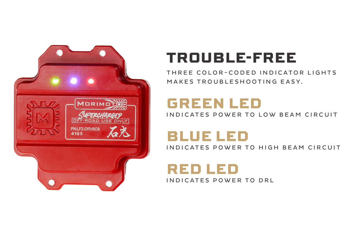 Trouble-Free: Three color-coded indicator lights on the back of the LED drivers not only help to assure you that everything is working properly, but if in the rare case that something isn't, also help you identify problems with minimal troubleshooting and/or disassembly. The Red LED confirms power to the DRL, the green LED confirms power to the low beam circuit, and the blue LED to the high beam circuit.